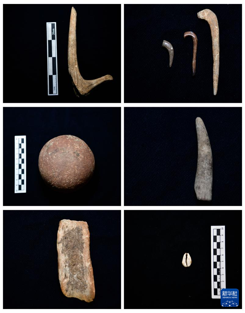 24日、穿洞遺跡から出土した骨器や石器などの考古学標本。(組み合わせ写真、普定=新華社記者/楊文斌)pagebreak