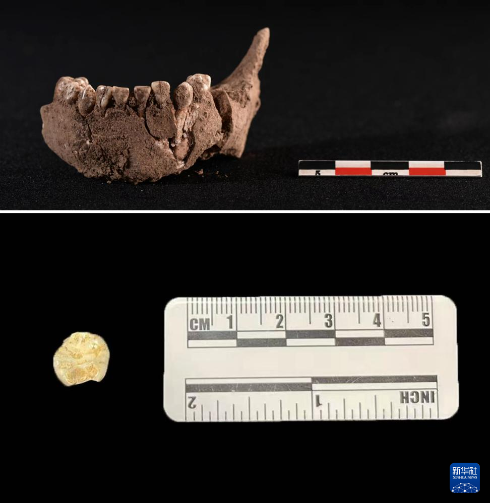穿洞遺跡から出土した人類の下顎と歯の化石。(資料写真、組み合わせ写真、普定=新華社記者/楊文斌)pagebreak