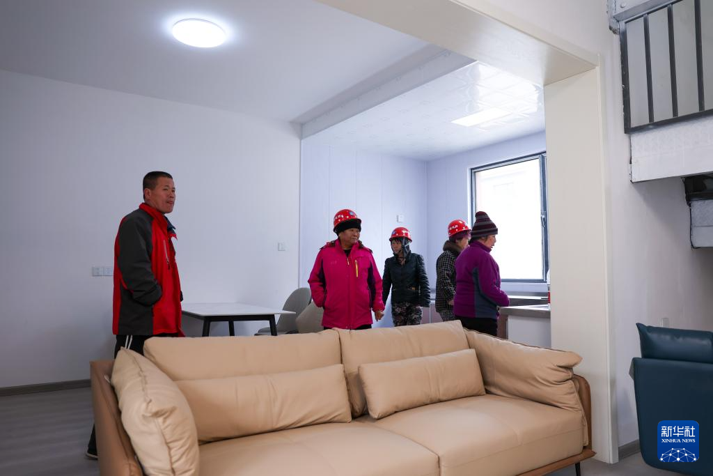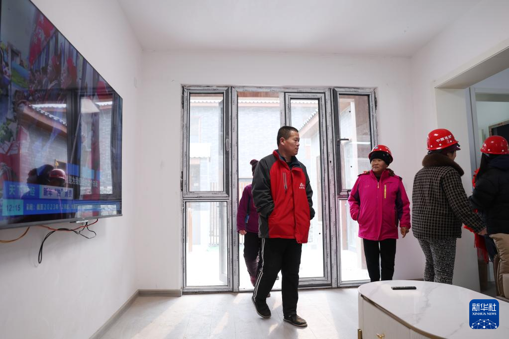 1月30日、北京市門頭溝区内の移転先に建てられた住宅のモデルルームを見学する村民ら。(北京=新華社記者/鞠煥宗)