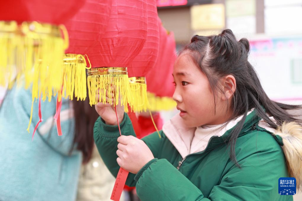 1月31日、貴州省黔東南ミャオ族トン族自治州岑鞏県の㵲水街道で、春節を祝うイベントに参加し猜灯謎(なぞなぞ遊び)を楽しむ子ども。(貴陽=新華社配信/唐鵬)