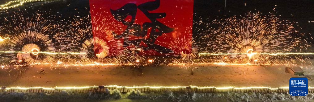 1月31日、河北省遵化市の新春氷雪祭で、伝統的なパフォーマンス「打鉄花」を披露する人。(小型無人機から、遵化=新華社配信/劉満倉)