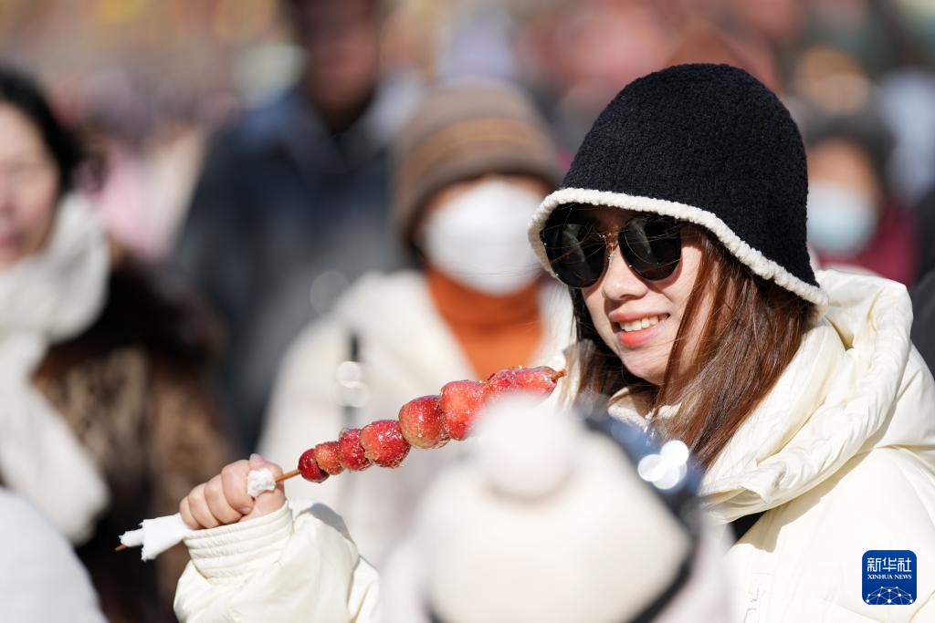 12日、黒竜江省ハルビン市の百年の歴史ある通り「中央大街」で、イチゴの糖葫芦(タンフールー)を味わう観光客。(ハルビン=新華社記者/王建威)pagebreak