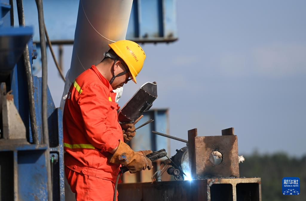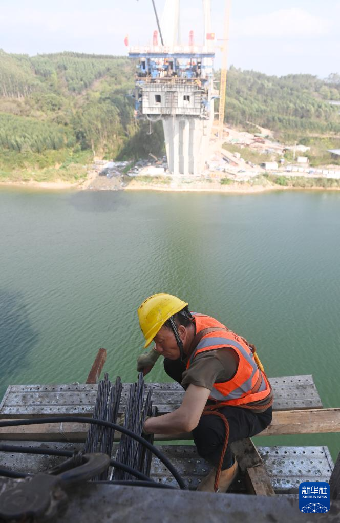 21日、六律邕江特大橋の建設現場で働く作業員。(南寧=新華社記者/陸波岸)