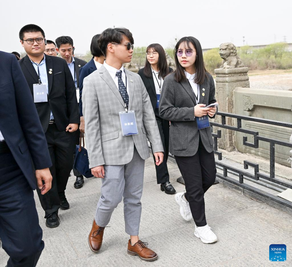 8日、盧溝橋を見学する台湾青年ら。(北京=新華社記者/陳曄華)