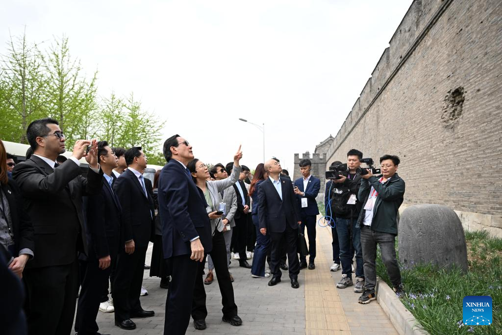 8日、宛平城の城壁を見学する馬英九氏一行。七七事変で日本軍から攻撃を受けた際の砲弾の跡が残っている。(北京=新華社記者/陳曄華)