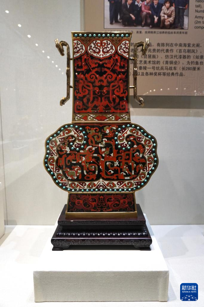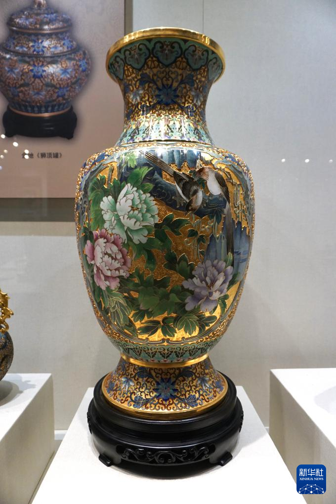 18日、景泰藍作品「金地周器罍」。(北京=新華社記者/許芸潁)