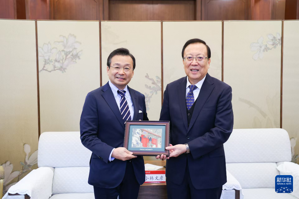 6日、日本の伊藤忠商事の小林文彦副社長と会談し、記念品を贈呈した北京大学共産党委員会の郝平書記(右)。(北京=新華社記者/郭丹)