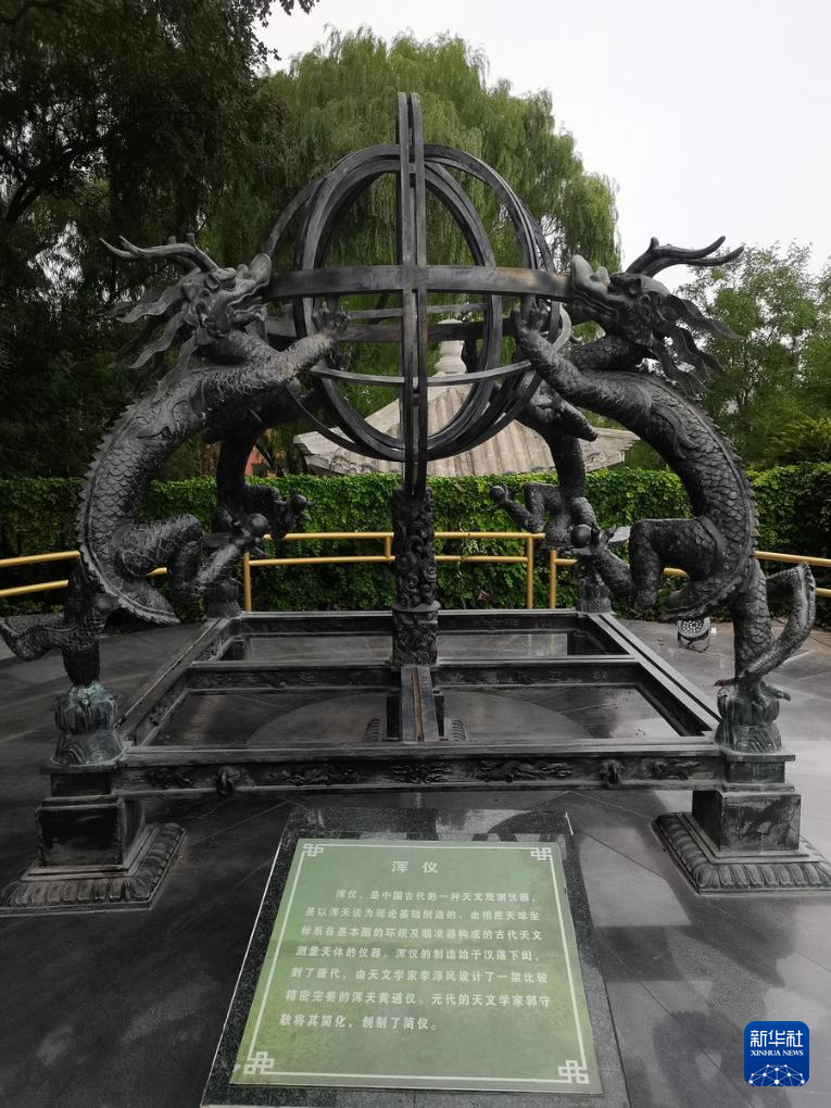 匯通祠(郭守敬記念館)の屋外に展示されている天体観測機器「渾天儀(こんてんぎ)」の模型。(8月23日撮影、北京=新華社記者/王巍)