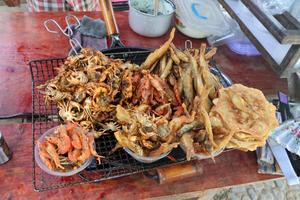 大圩古鎮で売られている小魚や小エビ、カニを使った小吃(軽食)。(8月7日撮影、桂林=新華社記者/藍建中)
