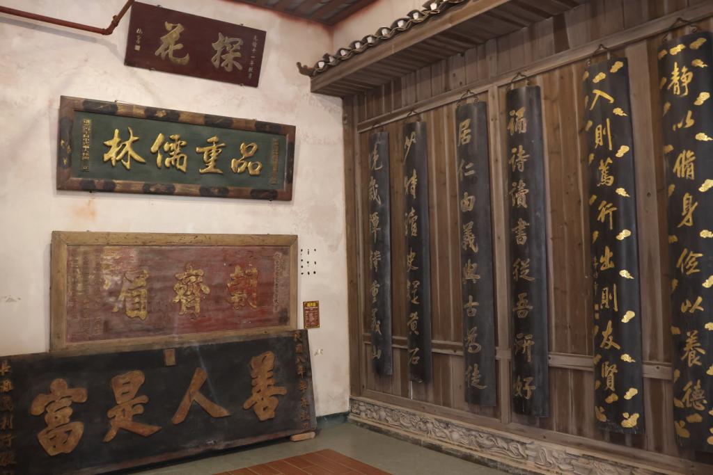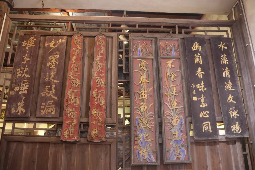 大圩古鎮博物館に展示されている扁額と楹聯(えいれん、建物の門の両脇に掛けた対句)。(8月7日撮影、桂林=新華社記者/藍建中)