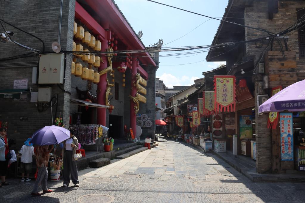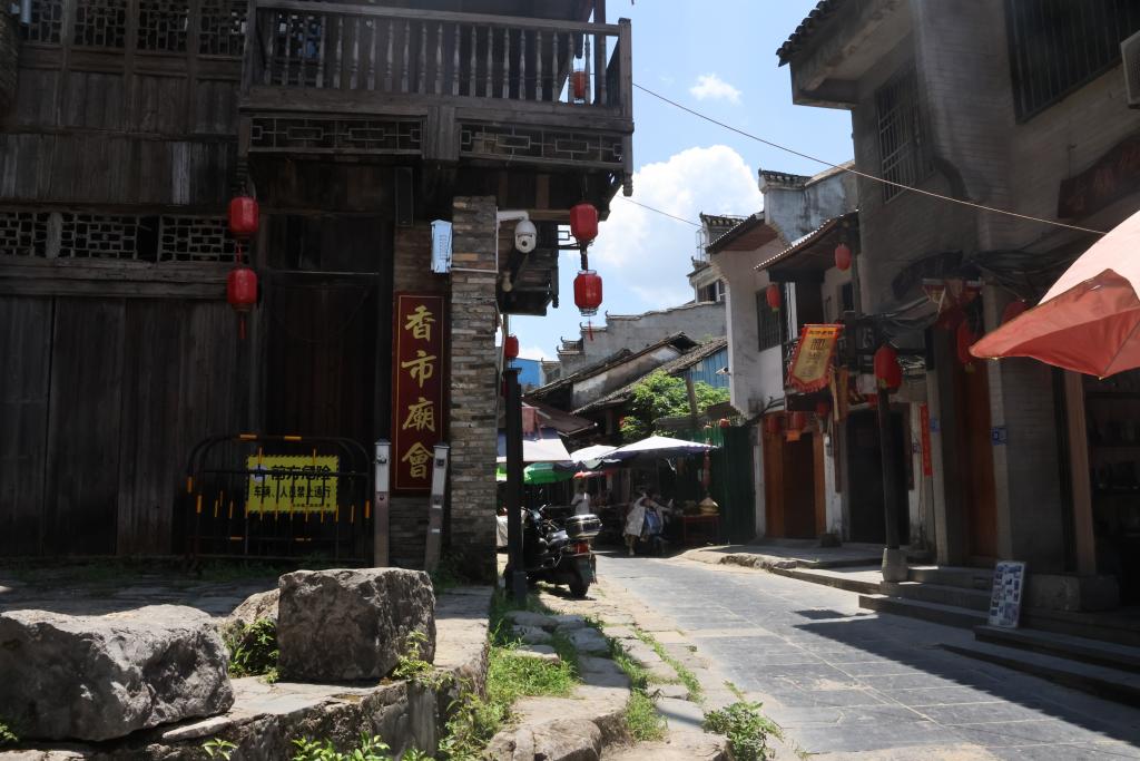 大圩古鎮の街道。手前左は万寿宮の入り口。(8月7日撮影、桂林=新華社記者/藍建中)