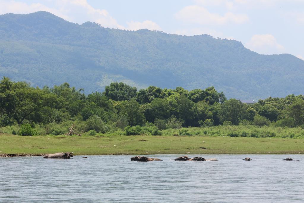 大圩古鎮の傍らを流れる漓江で水浴びをする水牛の群れ。(8月7日撮影、桂林=新華社記者/藍建中)