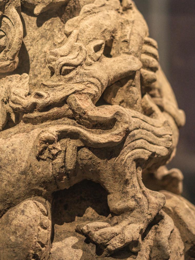 1月23日、四川省成都市の成都博物館に展示されている陶盤竜銜蛇座(とうばんりゅうかんじゃざ、後漢時代、部分)。 (成都=新華社記者/薛晨)