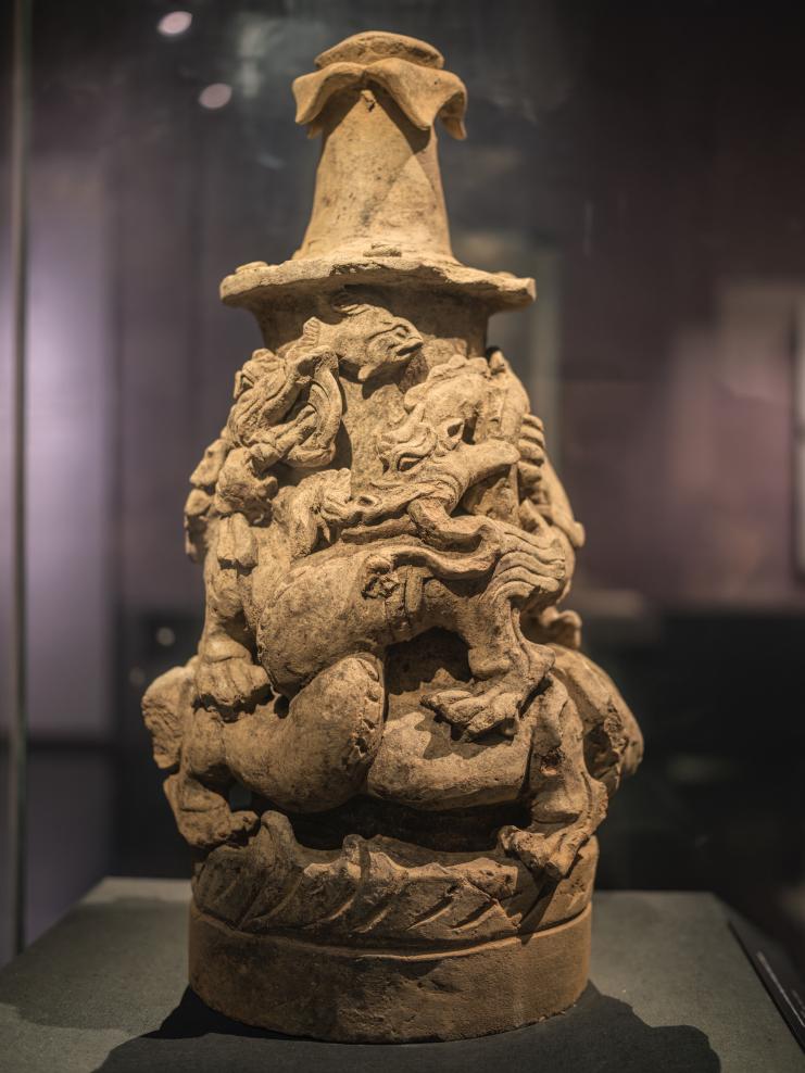 1月23日、四川省成都市の成都博物館に展示されている陶盤竜銜蛇座(とうばんりゅうかんじゃざ、後漢時代)。 (成都=新華社記者/薛晨)