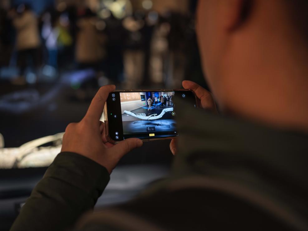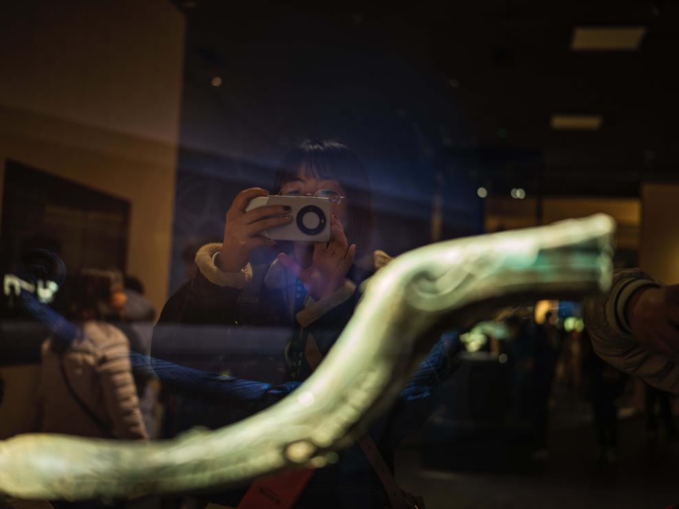 1月23日、四川省広漢市の三星堆博物館で、青銅蛇を撮影する人。(成都=新華社記者/薛晨)