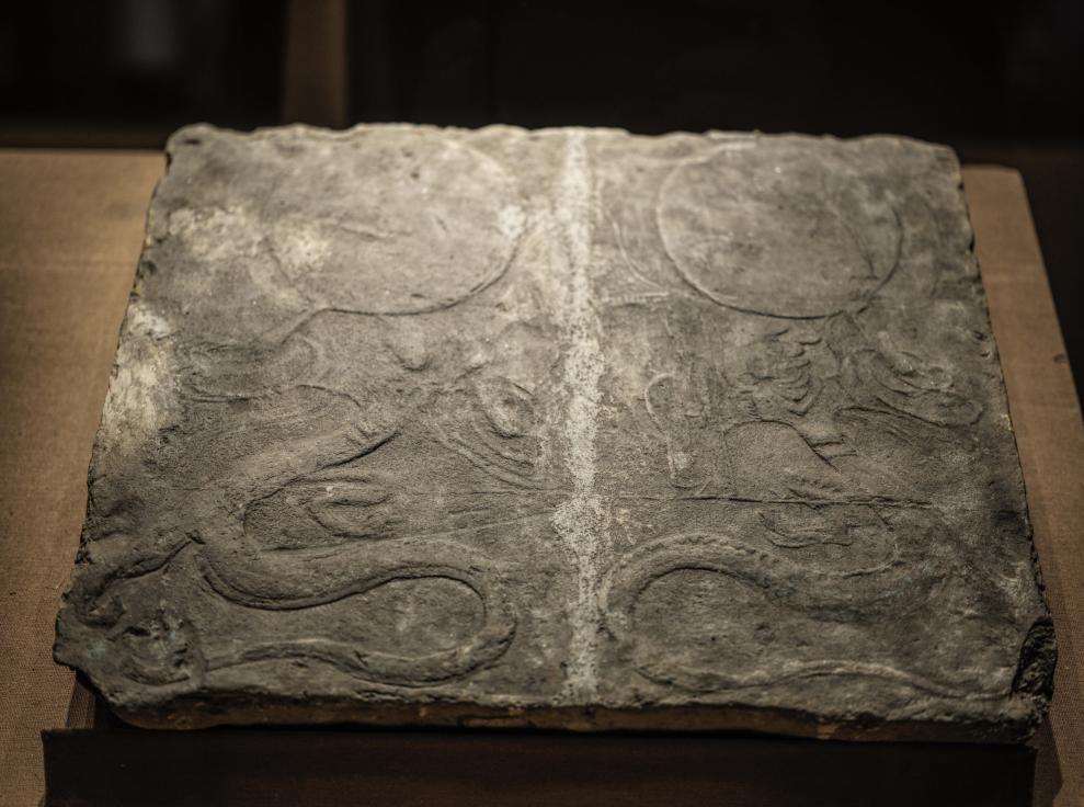 1月23日、四川省成都市の成都博物館に展示されている伏羲女媧画像磚(ふくぎじょかがぞうせん、後漢時代)。 (成都=新華社記者/薛晨)