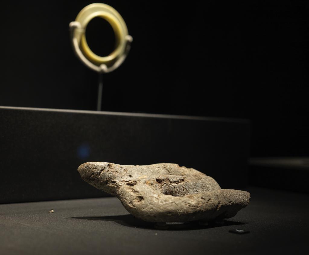 1月23日、四川省広漢市の三星堆博物館に展示されている石蛇(商代)。(成都=新華社記者/薛晨)