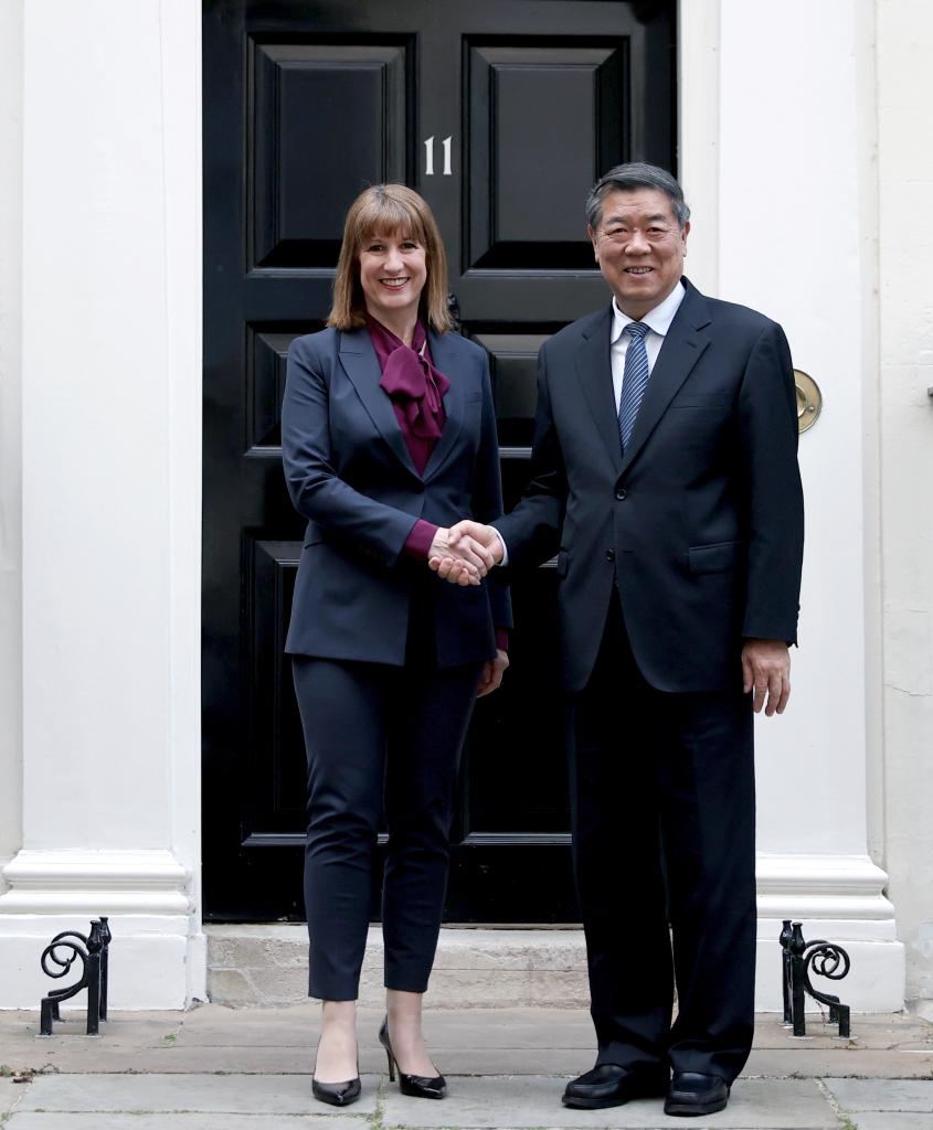 8日、リーブス財務相(右)と会見する何立峰副総理。(ロンドン=新華社記者/李穎)