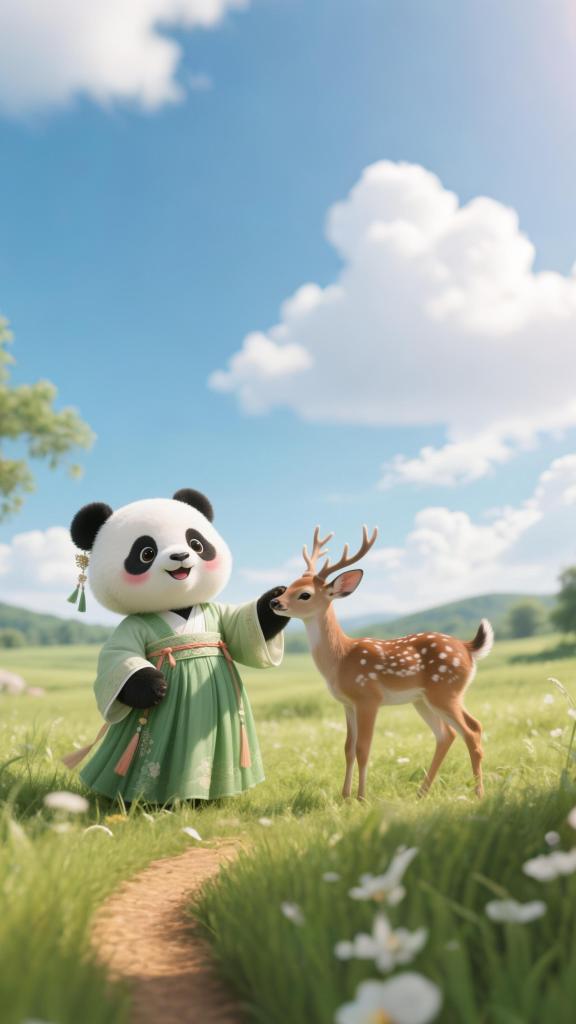 夏の空の下で子鹿と戯れる様子を表した壁紙。 (北京=新華社配信)