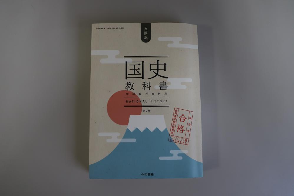 日本の令和書籍発行の中学校歴史教科書「国史教科書(第7版)」。(東京=新華社記者/陳沢安)