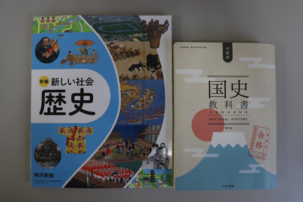 日本の東京書籍が出版する中学校の歴史教科書「新編 新しい社会 歴史」と令和書籍が出版する中学校の歴史教科書「国史教科書(第7版)」。(東京=新華社記者/陳沢安)
