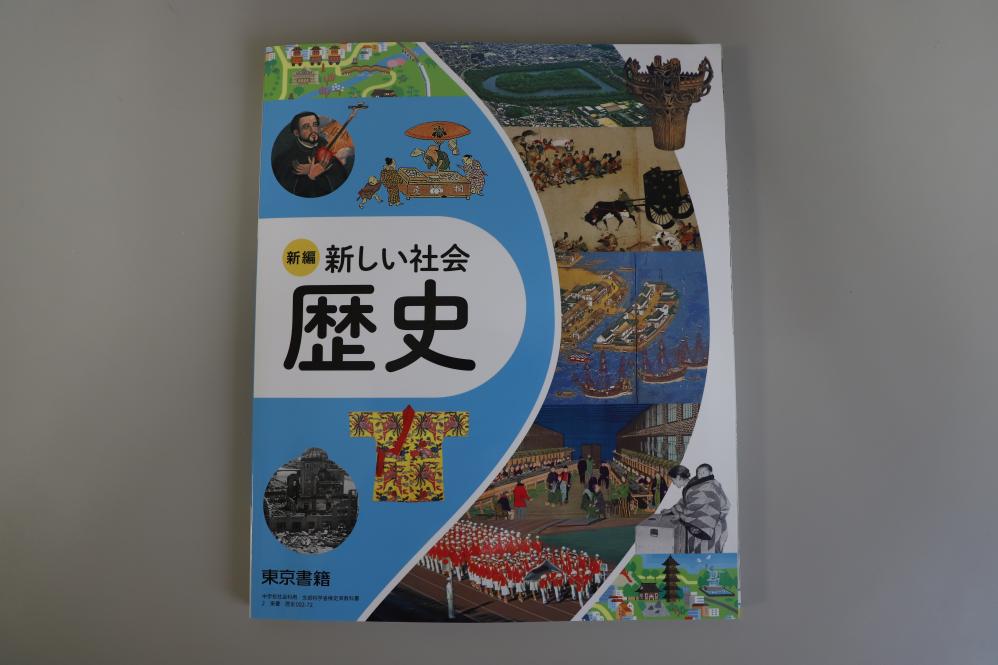 日本の東京書籍発行の中学校歴史教科書「新編 新しい社会 歴史」。(東京=新華社記者/陳沢安)