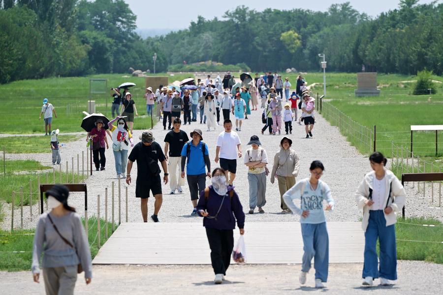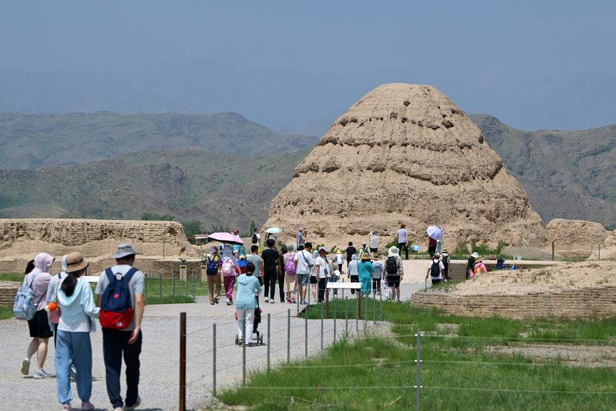 13日、西夏陵国家考古遺跡公園を見学する観光客。(銀川=新華社配信/袁宏彦)