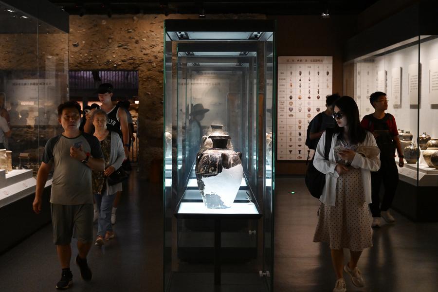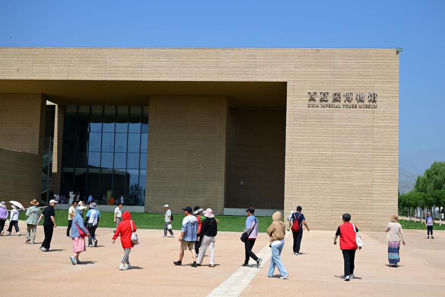 13日、西夏陵国家考古遺跡公園にある西夏陵博物館を見学する観光客。(銀川=新華社配信/袁宏彦)