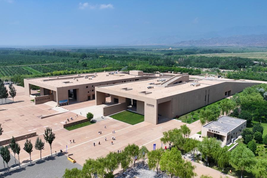 13日、西夏陵国家考古遺跡公園にある西夏陵博物館。(ドローンから、銀川=新華社配信/袁宏彦)