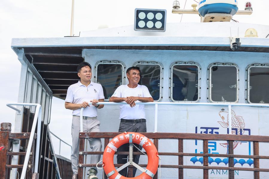海南省瓊海市潭門鎮に浮かぶ漁船から、遠くを眺める王書保さん(右)と息子の王振忠さん。(7月22日撮影、瓊海=新華社記者/張麗蕓)