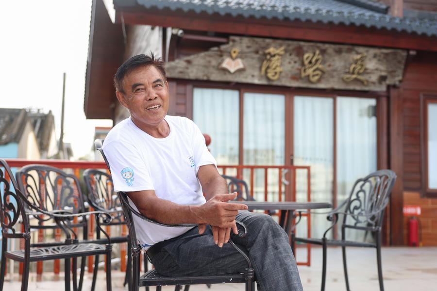 海南省瓊海市の更路簿博物館前に座る王書保さん。(7月22日撮影、瓊海=新華社記者/張麗蕓)