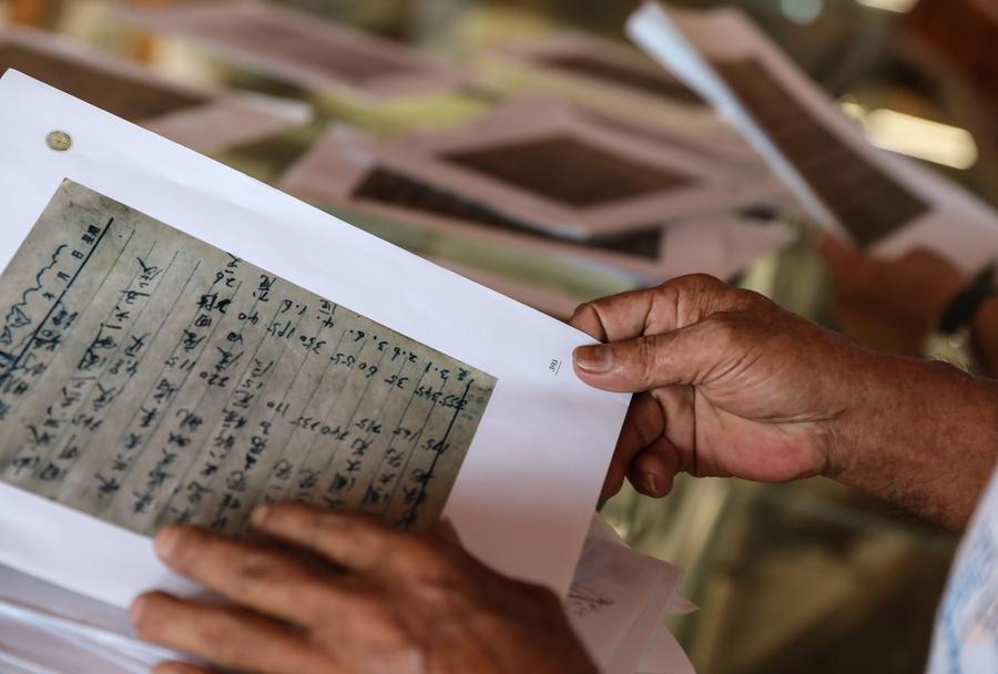 海南省瓊海市の更路簿博物館で、更路簿のコピーを整理する王書保さん。(7月22日撮影、瓊海=新華社記者/程婷婷)