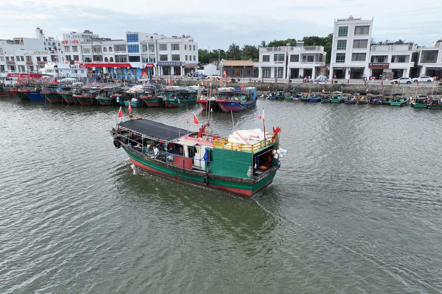 海南省瓊海市の潭門港を航行する漁船。(7月22日、ドローンから、瓊海=新華社記者/張麗蕓)