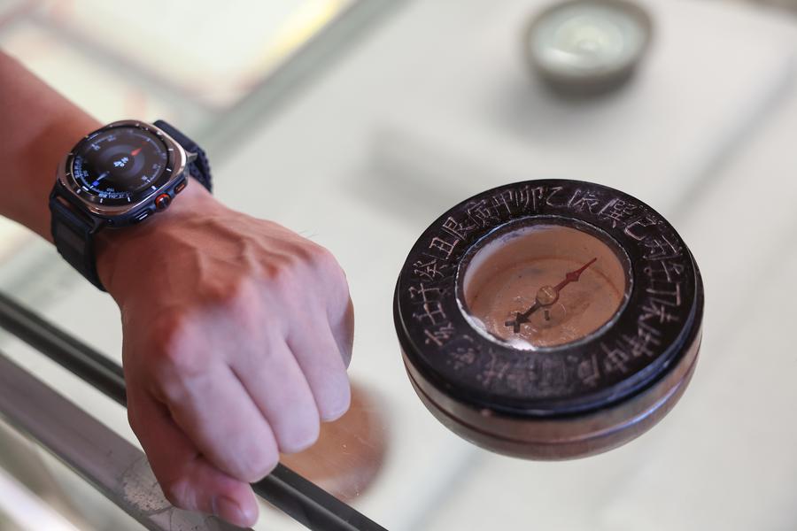 海南省瓊海市の更路簿博物館で、自身のコンパスと古い羅針盤の指す方位を見比べる来館者。(7月31日撮影、瓊海=新華社記者/張麗蕓)
