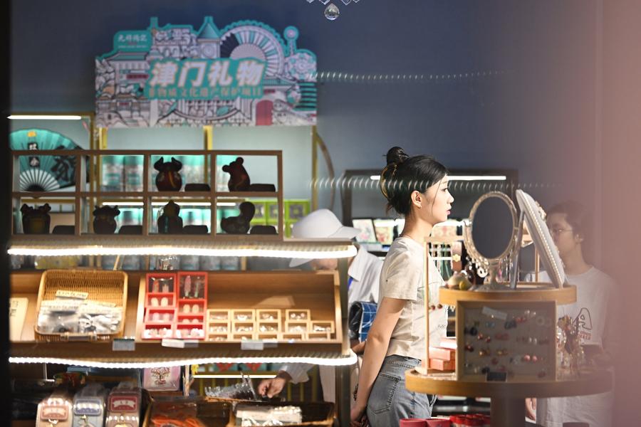 6日、天津市の歴史的建築、慶王府にある文化クリエーティブ製品ショップで、商品を選ぶ観光客。(天津=新華社記者/李然)
