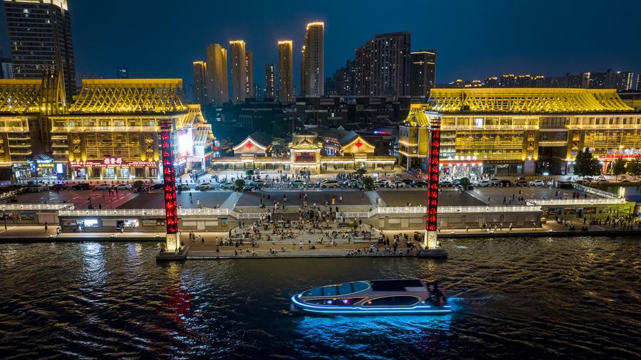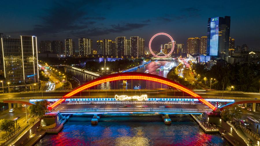 【新華社天津8月9日】中国天津市で開催予定の上海協力機構(SCO)天津サミットが近づき、街のあちらこちらでサミット関連の要素を目にするようになった。市内を流れる海河のほとりは夜になると美しくライトアップされ、盛大なイベントを迎える雰囲気が高まっている。
