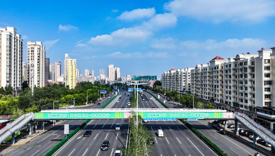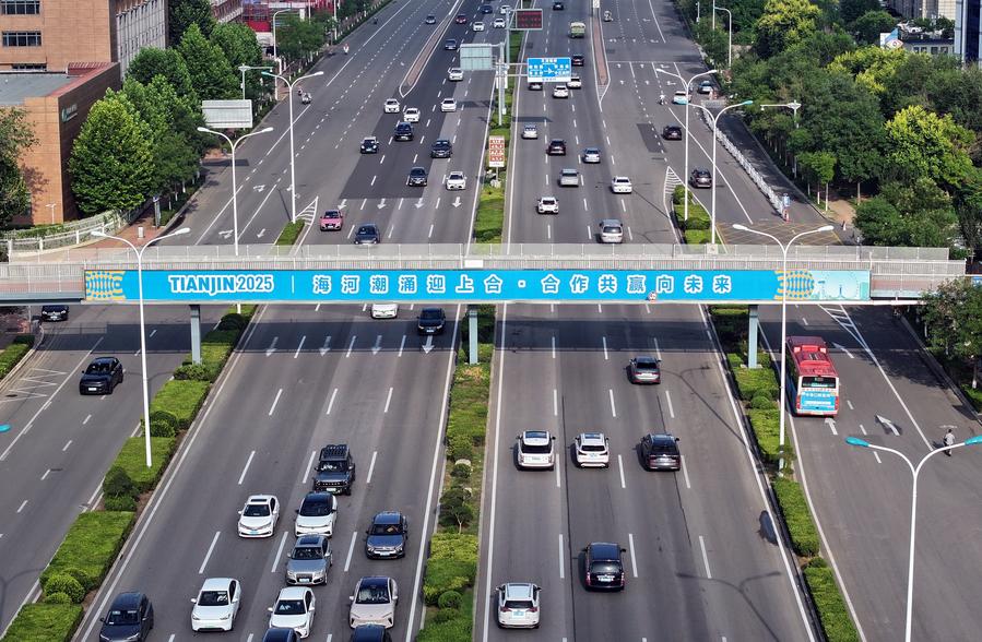 5日、天津市西青区の歩道橋に掲げられたSCO天津サミットを歓迎する横断幕。(ドローンから、天津=新華社記者/李然)