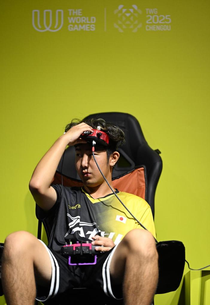 16日、ドローンレースの決勝前の橋本勇希。(成都=新華社記者/張博文)