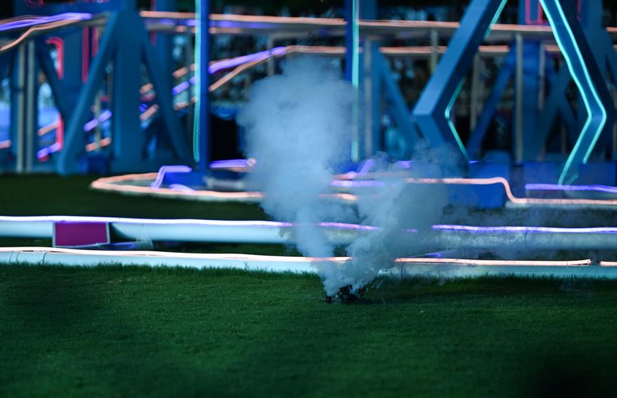 16日、試合中に墜落して煙を出したドローンを処理するスタッフ。(成都=新華社記者/張博文)