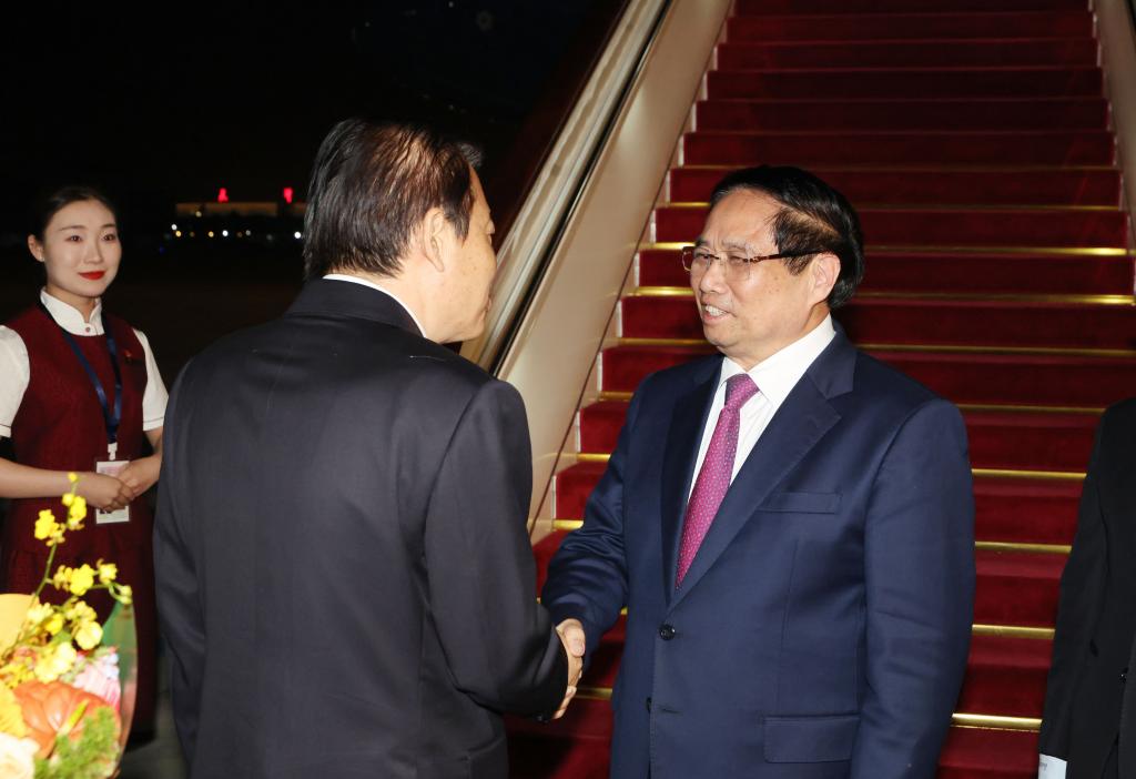 30日、天津に到着したファム・ミン・チン氏(右)。(天津=新華社記者/楊青)