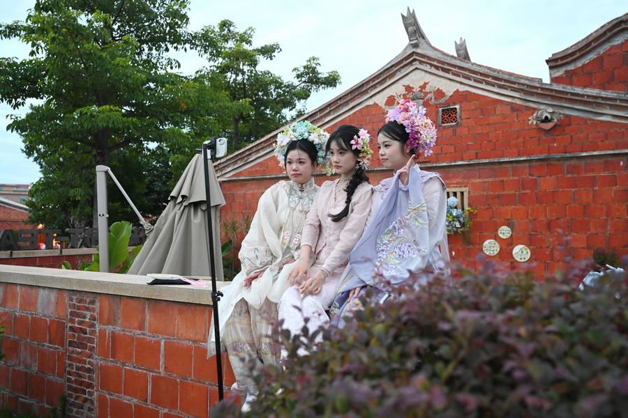 8月19日、梧林伝統村落にある赤れんが造りの古民家前で撮影を楽しむ観光客。(泉州=新華社記者/林善伝)
