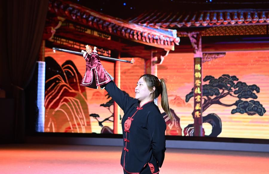8月19日、梧林伝統村落で掌中木偶(人形)劇を披露する人形遣い。(泉州=新華社記者/肖瀟)
