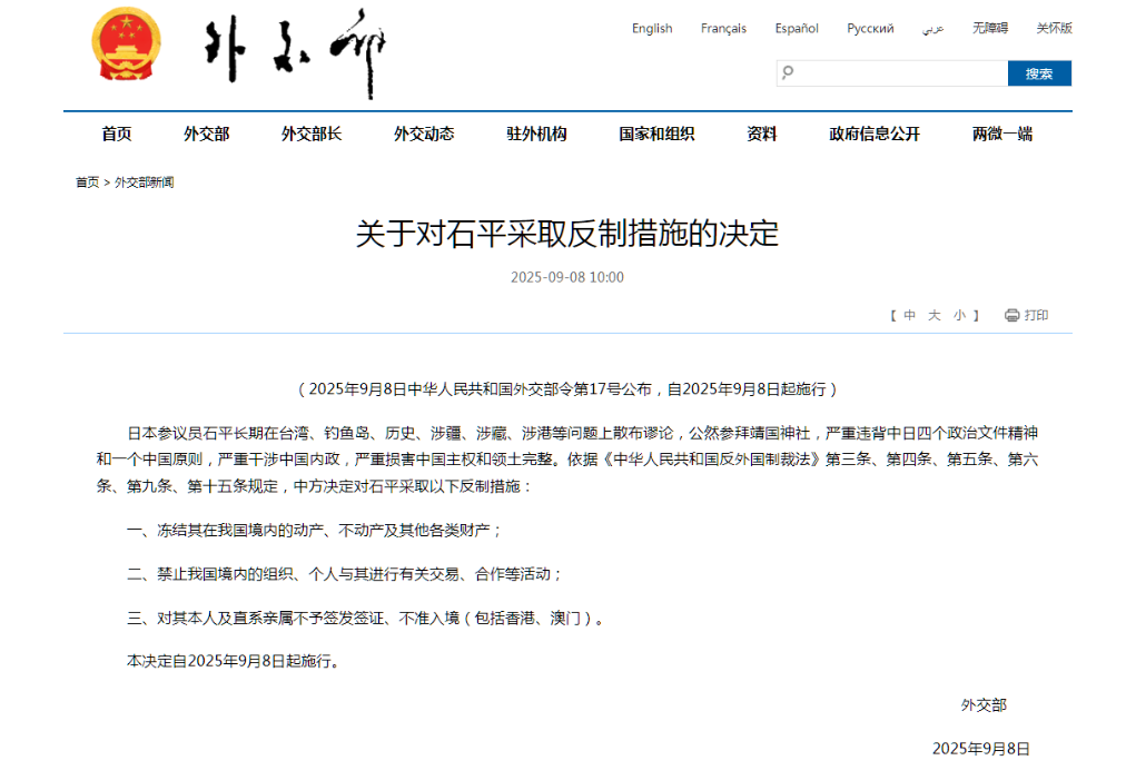 【新華社北京9月8日】中国外交部は8日、日本の石平(せき・へい)参議院議員に対し、反外国制裁法に基づく制裁を科すと発表した。台湾や釣魚島、歴史、新疆・西蔵・香港などに関わる問題で長期にわたり誤った主張を繰り返し、靖国神社を公然と参拝するなど、中日間の四つの政治文書の精神や「一つの中国」原則に反し、中国の内政に干渉し、中国の主権と領土の一体性を著しく損なったとした。