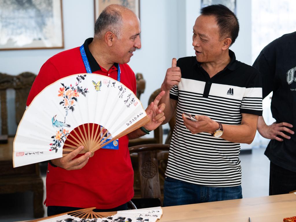 8日、雲南省紅河ハニ族イ族自治州蒙自市で扇面画を見学するフォーラム参加者(左)。(昆明=新華社記者/高咏薇)