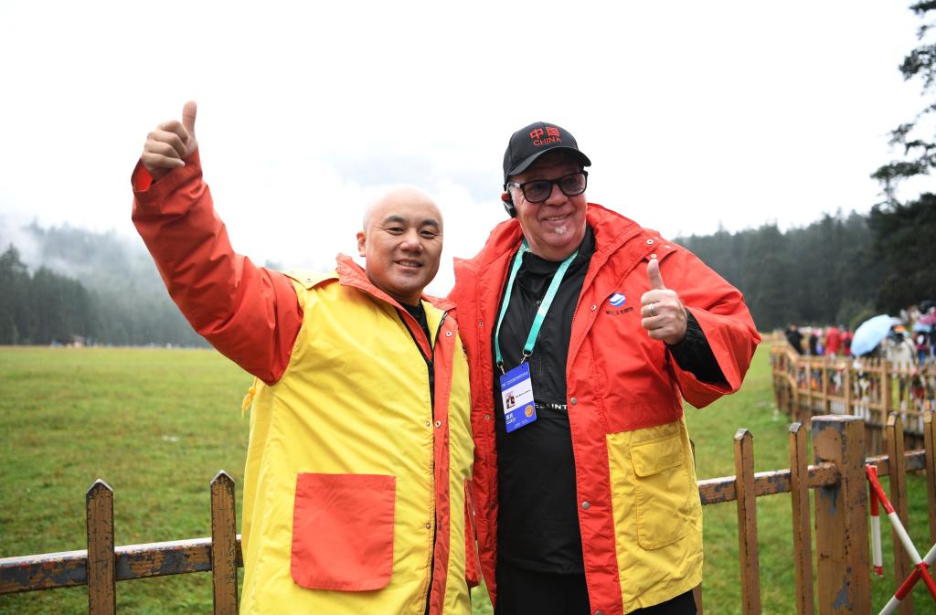 8日、雲南省麗江市の玉竜雪山風景区の雲杉坪で記念撮影するフォーラム参加者(右)。(昆明=新華社記者/金馬夢妮)