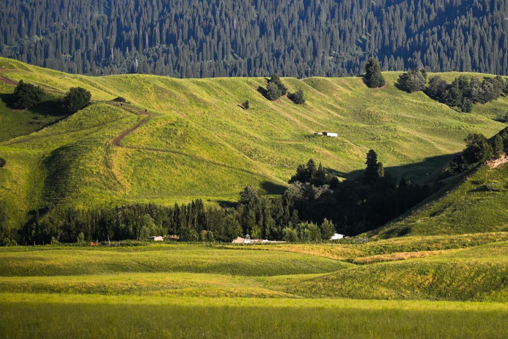 新疆ウイグル自治区イリ・カザフ自治州新源県にある那拉提(ナラティ)草原の風景。(8月3日撮影、新源=新華社記者/辛悦衛)