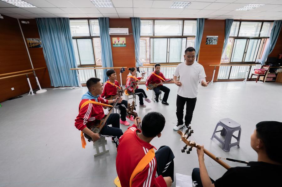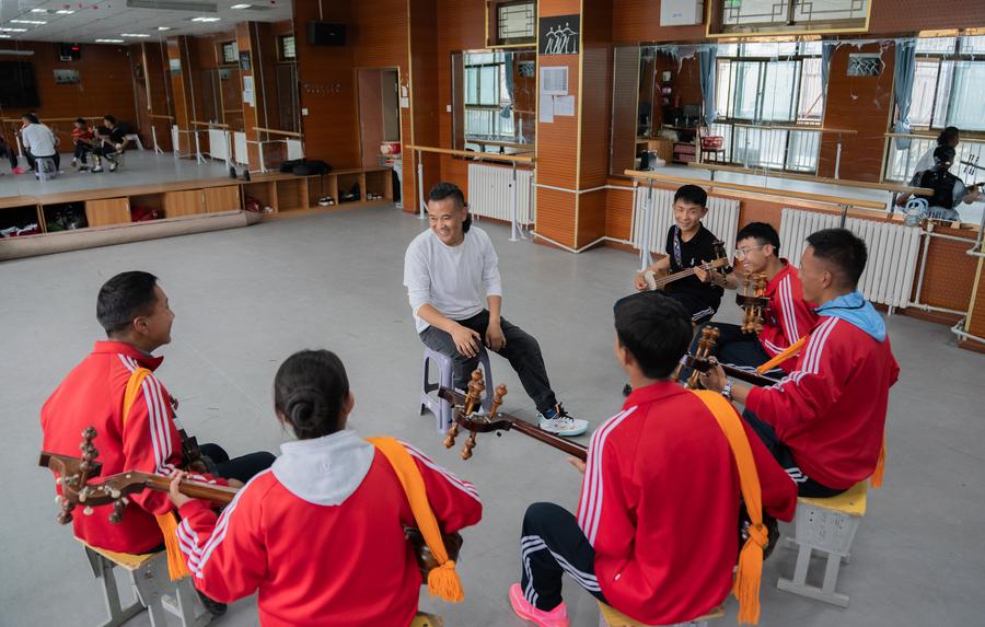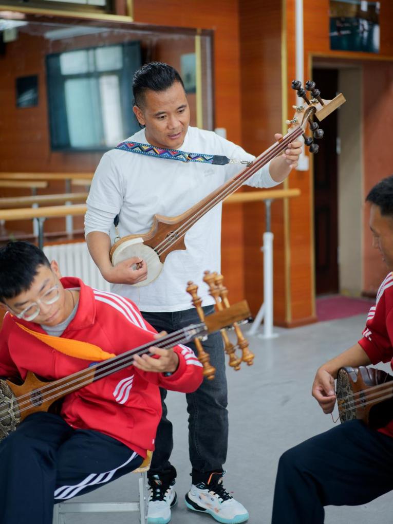 9日、ラサ市第二中等職業技術学校で、生徒にダニェンの演奏のこつを教える教師。(ラサ=新華社記者/丁増尼達)