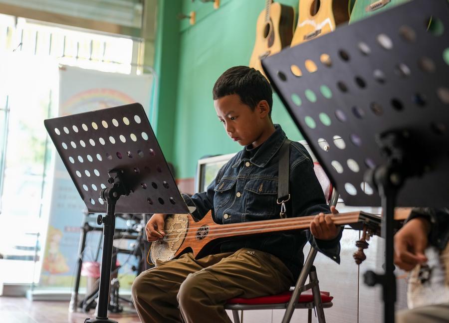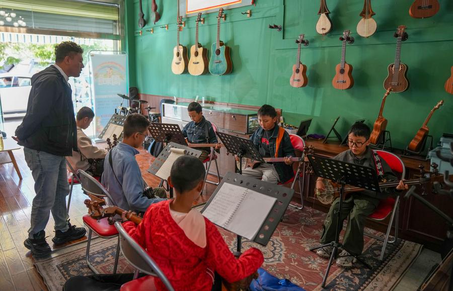 13日、ラサ市にあるダニェン販売店、古楽扎念琴行でダニェンを弾く子どもたち。(ラサ=新華社記者/晋美多吉)