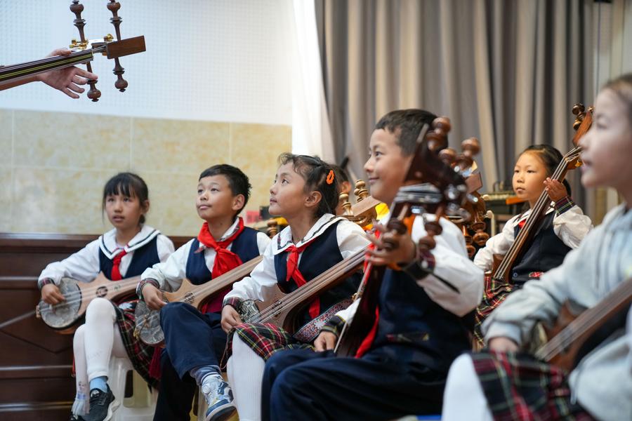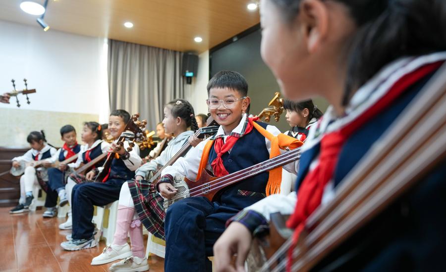 11日、ラサ市実験小学校でダニェンを弾く子どもたち。(ラサ=新華社記者/晋美多吉)