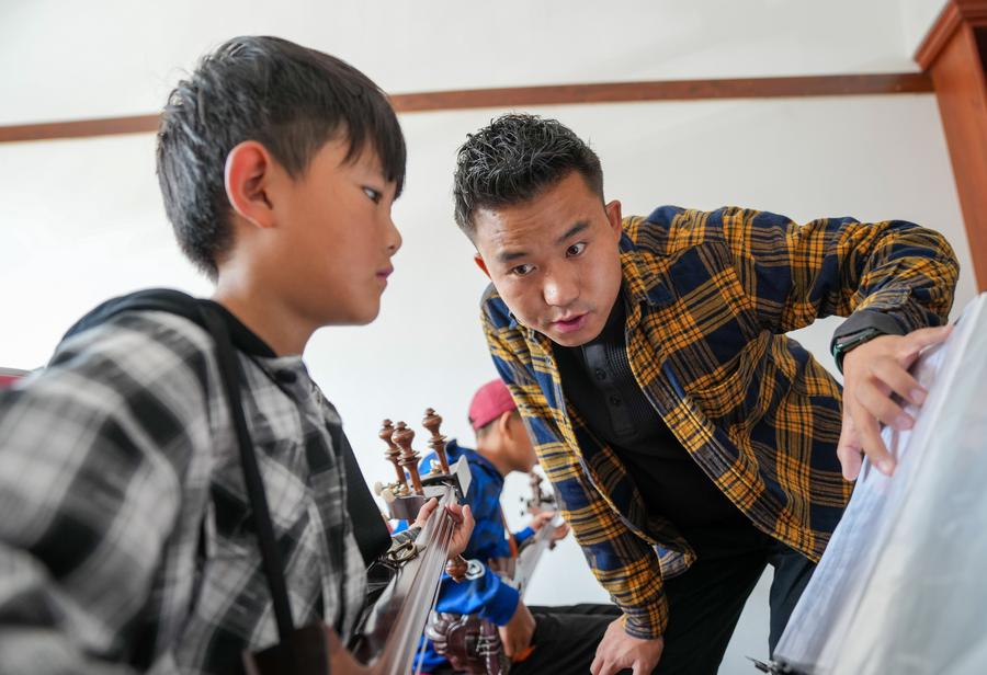 9日、ラサ市第二中等職業技術学校で、生徒の演奏を修正する教師。(ラサ=新華社記者/張笑宇)